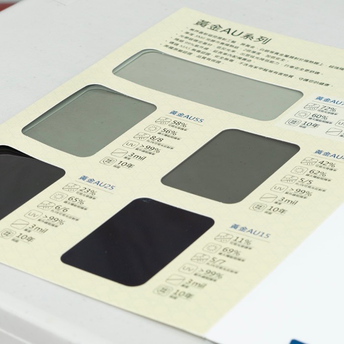 使用黃金等多種貴金屬在膜層之間,可見光穿透的同時將紅外線(熱源)反射,高阻隔紫外線的同時更具備低內反,總隔熱率69%(AU15)以及內反率6%,是達到透光率、隔熱率和反光率完美平衡的產品!紙張厚度3mil高於一般汽車隔熱紙,達2倍厚度,更加安全。